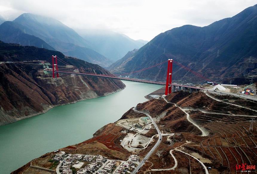 瀘定大渡河大橋由四川交投藏高公司投資建設(shè),主橋?yàn)?100米單跨鋼桁梁懸索橋,已于2018年12月通車(chē)。從遠(yuǎn)處眺望,峽谷間橫亙鮮艷的一抹紅。它不僅成為新晉的“網(wǎng)紅打卡地”,更成為當(dāng)?shù)氐臉?biāo)志性建筑。