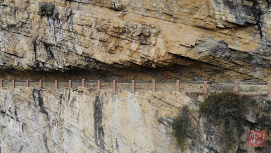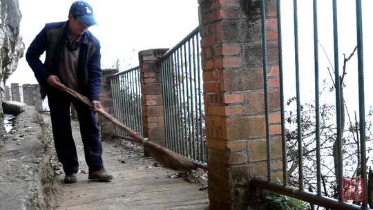 如今四十余年過去,岔河人每天仍在使用引水渠灌溉著李子樹和柑橘樹,而后又給大堰加固了圍欄,使之更加安全。岔河村民姜陽俊每天都會在這條通往水潦集市的必經(jīng)之路上清掃,將被風吹亂的樹葉掃到一邊,這份絕壁清道夫的工作他已經(jīng)做了很多年,他說:“我以前怕這個大堰,現(xiàn)在敬這個大堰?!?/p>