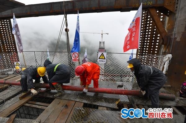 四川鐵投四川路橋金陽(yáng)河特大橋項(xiàng)目部工程科科長(zhǎng)俞坤升介紹,針對(duì)大橋建設(shè)難點(diǎn),項(xiàng)目部自行研發(fā)多項(xiàng)“黑科技”,力克安全風(fēng)險(xiǎn)和技術(shù)難關(guān)。比如,項(xiàng)目研發(fā)的自爬式多功能提升系統(tǒng),可實(shí)現(xiàn)鋼管安裝、C80澆筑、外包及隔板施工同步作業(yè),節(jié)約工期3個(gè)月,并將重達(dá)45噸的鋼管輕松吊到墩頂。