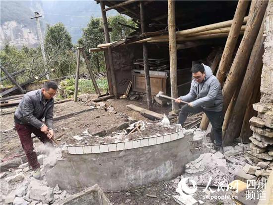 | 王磊幫易地搬遷戶余其虎拆除舊房子。四川公路設(shè)計(jì)院供圖 |