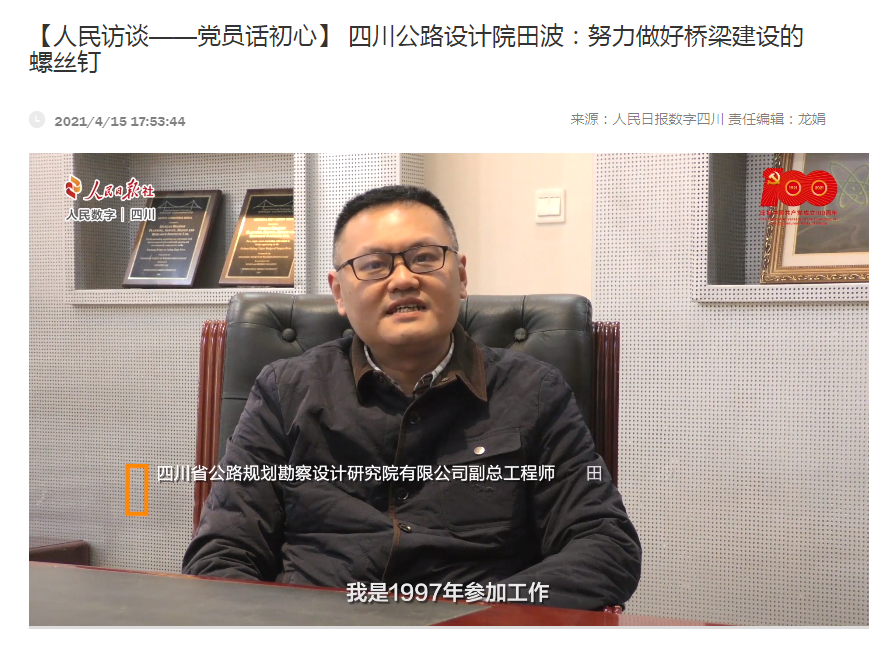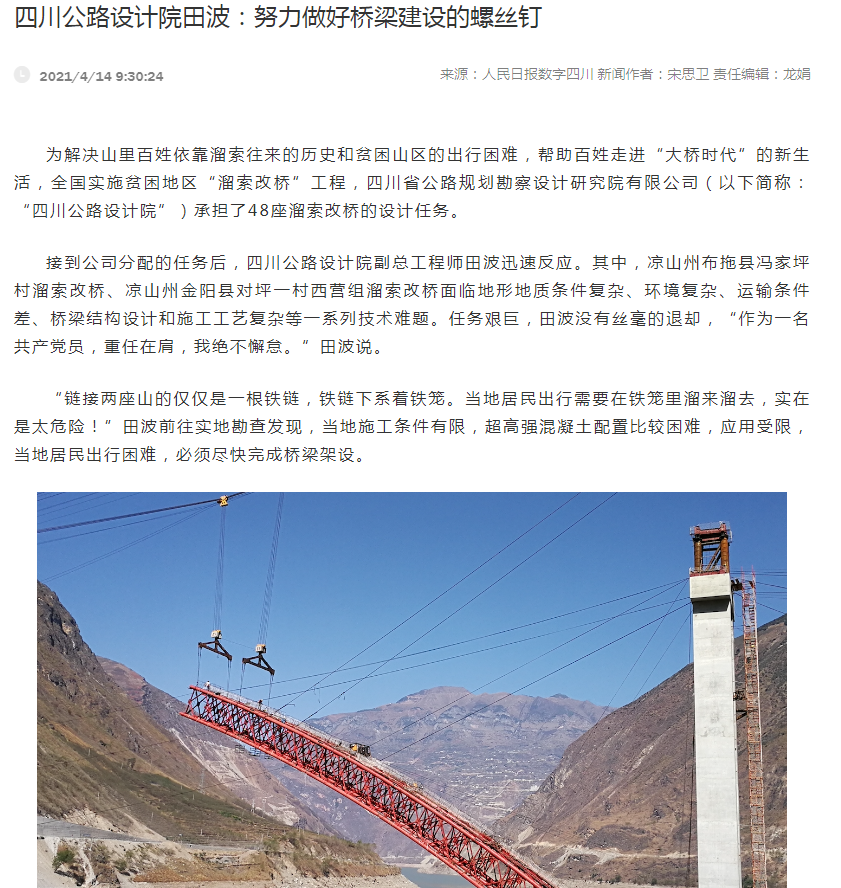 相關(guān)報道以《 四川公路設(shè)計院田波:努力做好橋梁建設(shè)的螺絲釘》為題于近日推出。報道中,田波副總工程師結(jié)合黨員的初心使命,重點講述了公司承擔(dān)的涼山州金陽縣對坪、布拖縣馮家坪等溜索改橋和宜賓南溪長江大橋、雞鳴三省大橋等渡改橋民生工程的設(shè)計故事,展現(xiàn)了優(yōu)秀共產(chǎn)黨員的精神風(fēng)貌和公司勇?lián)鐣?zé)任的良好形象。