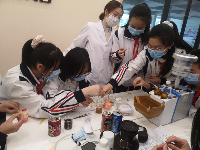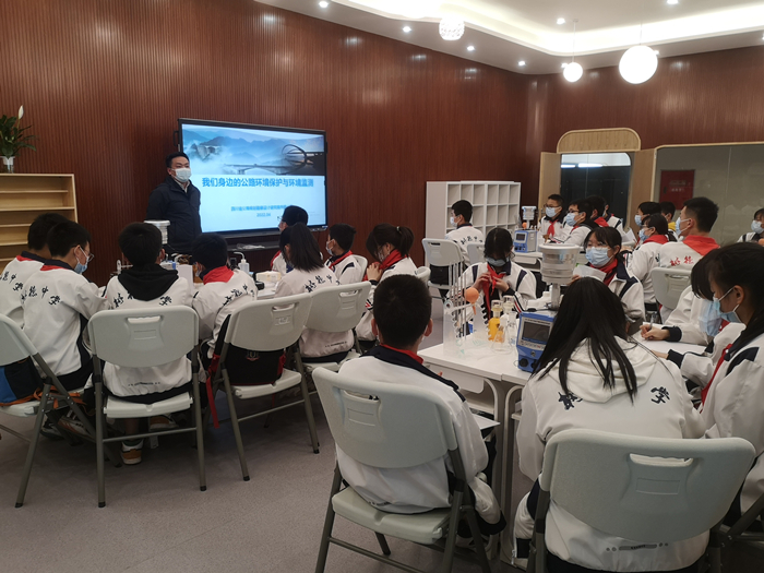 ??第三,環(huán)境監(jiān)測齊動手。宣講團隊簡要介紹了環(huán)境監(jiān)測的概念及主要內容。在環(huán)境監(jiān)測實驗環(huán)節(jié),同學們分為四組開展了噪聲聲級計、大氣采樣器的操作及水質pH、溶解氧的測定演示。生態(tài)環(huán)境監(jiān)測實驗室工作人員分組進行指導,對儀器的功能、操作流程和原理進行細心講解和示范指導,協助同學們實際操作。在陣陣驚奇之余,同學們在操作過程中感知了環(huán)境監(jiān)測的魅力,紛紛與宣講人員交流互動,探究原理。