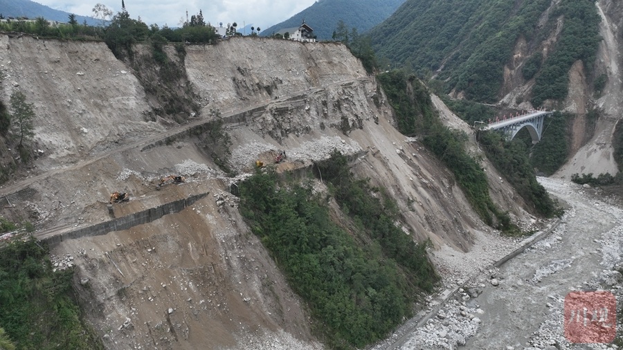 經(jīng)過青崗坪大橋后,約6公里左右就可抵達海螺溝景區(qū)1號營地。此前,川觀新聞記者通過航拍看到,這段路受損較嚴重,多處被垮塌的山體掩埋,有的路段路基垮塌,成了斷點。
