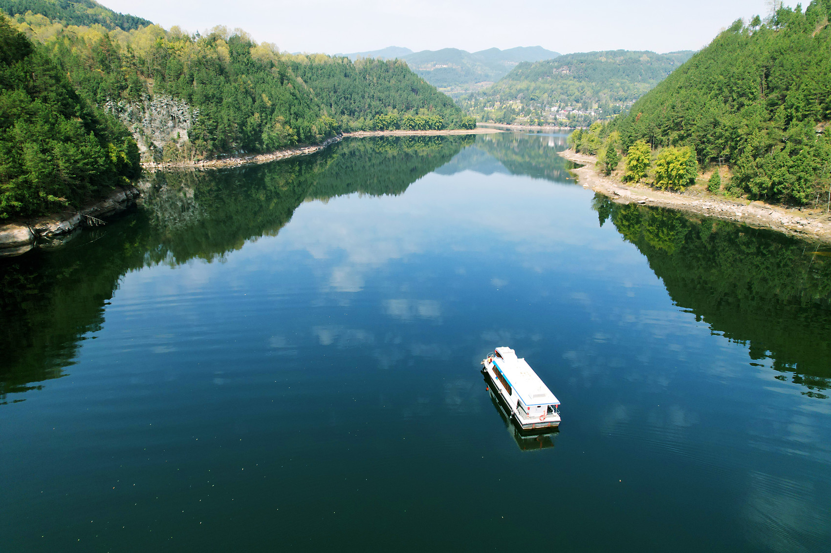 在巴中化成水庫,一艘新能源渡船航行在碧水清波上。四川省交通運輸廳 供圖