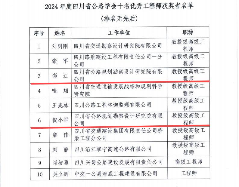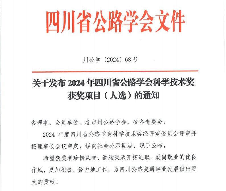 根據(jù)四川省公路學(xué)會(huì)《關(guān)于發(fā)布2024年四川省公路學(xué)會(huì)科學(xué)技術(shù)獎(jiǎng)獲獎(jiǎng)項(xiàng)目(人選)的通知》(川公學(xué)〔2024〕68號(hào))的文件,我公司邵江、倪小軍等2位同志獲評(píng)“十名優(yōu)秀工程師”稱號(hào),肖莉、周水文等2名同志獲評(píng)“優(yōu)秀科技工作者”稱號(hào),楊楓、蔣瑜陽(yáng)、狄秉臻等3名同志獲評(píng)“青年科技獎(jiǎng)”。特此祝賀!