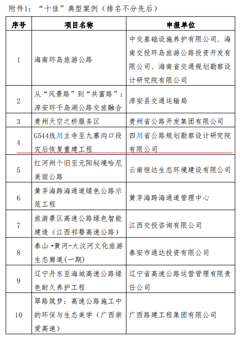 近日,由中國交通運輸協(xié)會交通綠色發(fā)展專業(yè)委員會組織評選,經(jīng)過初評、復(fù)評,中國交通運輸協(xié)會《美麗公路建設(shè)系列典型案例》發(fā)布,我司G544線川主寺至九寨溝縣城段災(zāi)后恢復(fù)重建工程項目榮獲“十佳”典型案例,雅安至康定高速公路雅安至瀘定段榮獲優(yōu)秀案例(共16個優(yōu)秀案例)。此次參評項目包括高速公路、國省干道、農(nóng)村公路等公路項目共計100余項。