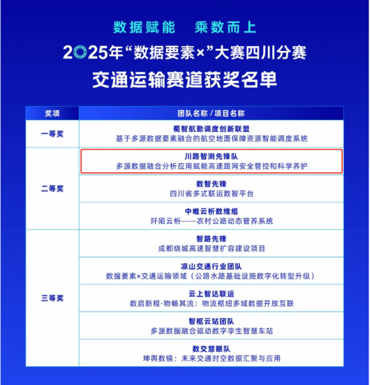 近日,以“數(shù)據(jù)賦能,乘數(shù)而上”為主題的2025年“數(shù)據(jù)要素×”大賽四川分賽獲獎(jiǎng)發(fā)布儀式暨數(shù)據(jù)產(chǎn)業(yè)大會(huì)在遂寧市舉辦。本屆大賽共組織14個(gè)賽道,吸引省內(nèi)外數(shù)千人參賽,經(jīng)過(guò)激烈角逐,我司參賽項(xiàng)目“多源數(shù)據(jù)融合分析應(yīng)用,賦能高速路網(wǎng)安全管控和科學(xué)養(yǎng)護(hù)”榮獲交通運(yùn)輸賽道二等獎(jiǎng)。并將代表四川交通參加 2025 年“數(shù)據(jù)要素x”大賽全國(guó)總決賽。