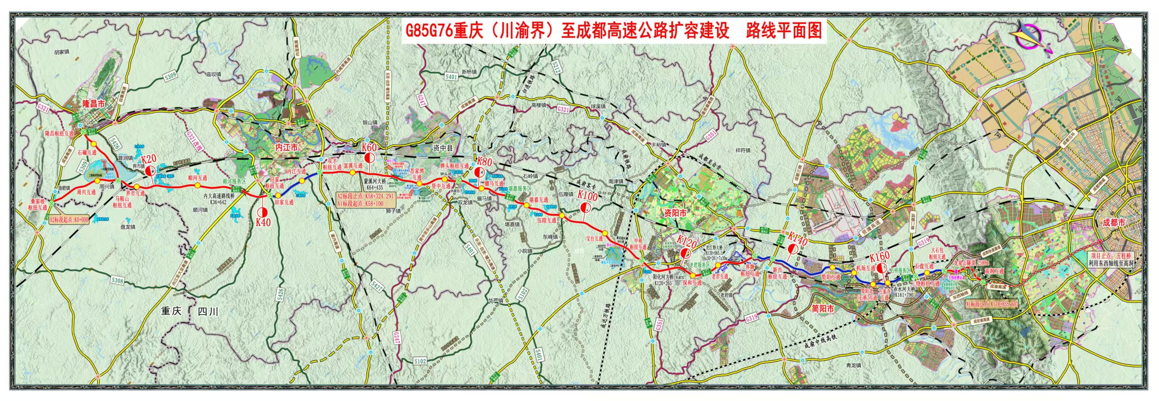 作為連接成都與重慶的交通大動脈──成渝高速公路四川段,是四川省首條高速公路,被譽為“西南第一路”,在區(qū)域經(jīng)濟發(fā)展中扮演了至關重要的角色,隨著成渝地區(qū)的社會經(jīng)濟快速發(fā)展,成渝高速的車流量不斷增長,原有四車道設計已難以滿足日益增長的通行需求,尤其在節(jié)假日高峰期,擁堵現(xiàn)象頻發(fā),擴容升級勢在必行。因此,為緩解交通壓力、提升通行效率,成渝高速擴容項目于2023年正式啟動。該項目起于內(nèi)江市桑家坡(川渝界),接G85銀昆高速公路重慶段,途經(jīng)內(nèi)江市、資陽市、成都市,止于龍泉驛區(qū)高洞,接已建成的成都市東西軸線城市道路,全長約190公里,其中主線長179公里,隆昌支線長11公里,采用“局部改線新建+原路改擴建”模式,將原有雙向四車道升級為雙向八車道,其中,雙才樞紐至界牌樞紐設計時速為120公里,其余路段設計時速為100公里,通行能力將提升至日均8萬輛次。項目預計于2028年建成。