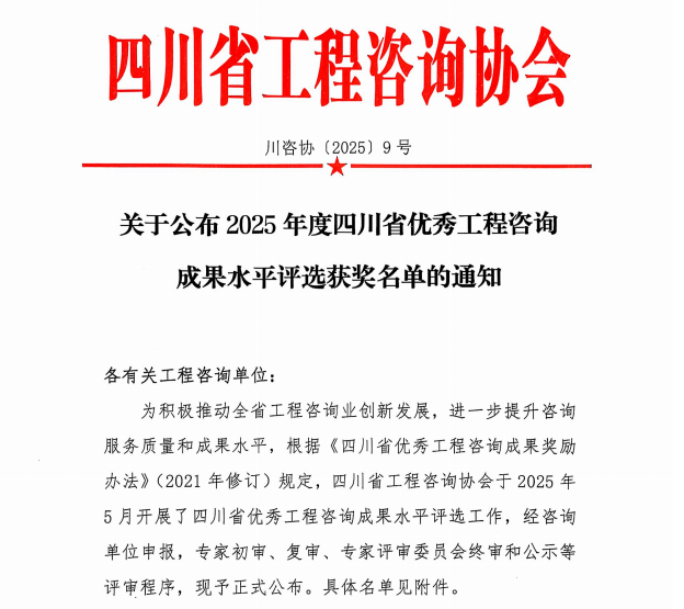 近日,省工程咨詢協(xié)會公布了2025年度四川省優(yōu)秀工程咨詢成果水平評選獲獎名單,我司7項成果榮獲此殊榮,其中一等獎3項、二等獎4項。