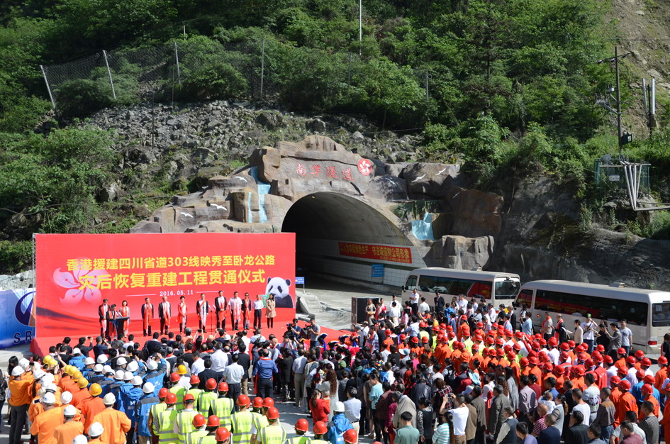 5月11日,由我院監(jiān)理、香港特別行政區(qū)援建的省道303線映(秀)臥(龍)路災后恢復重建工程貫通儀式在南華隧道入口處舉行。省交通運輸廳黨組成員、總工程師陳樂生主持儀式,香港特區(qū)政府政務司司長林鄭月娥致辭,省政府副秘書長趙衛(wèi)平宣布貫通。