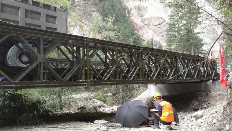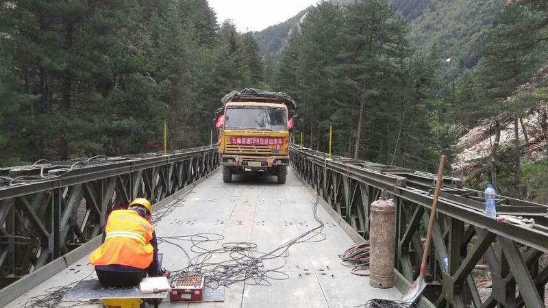 8月24日和25日,我院派出兩組試驗(yàn)檢測(cè)人員對(duì)自行設(shè)計(jì)的兩座鋼便橋開展現(xiàn)場(chǎng)荷載試驗(yàn),并于26日順利完成。本次試驗(yàn)系我院首次開展鋼便橋類荷載試驗(yàn),面臨經(jīng)驗(yàn)積累少、計(jì)算難度大、試驗(yàn)要求高等難題。為保證試驗(yàn)圓滿完成,我院多方收集資料,提前編制詳細(xì)的試驗(yàn)方案,利用精密水準(zhǔn)儀和TDS-602應(yīng)變采集系統(tǒng)等設(shè)備準(zhǔn)確收集橋梁撓度和應(yīng)變數(shù)據(jù),高效完成現(xiàn)場(chǎng)試驗(yàn)。結(jié)果顯示,實(shí)測(cè)數(shù)據(jù)與理論值相符,承載能力滿足設(shè)計(jì)要求,為川九路保通保暢和災(zāi)后恢復(fù)重建奠定堅(jiān)實(shí)基礎(chǔ)。