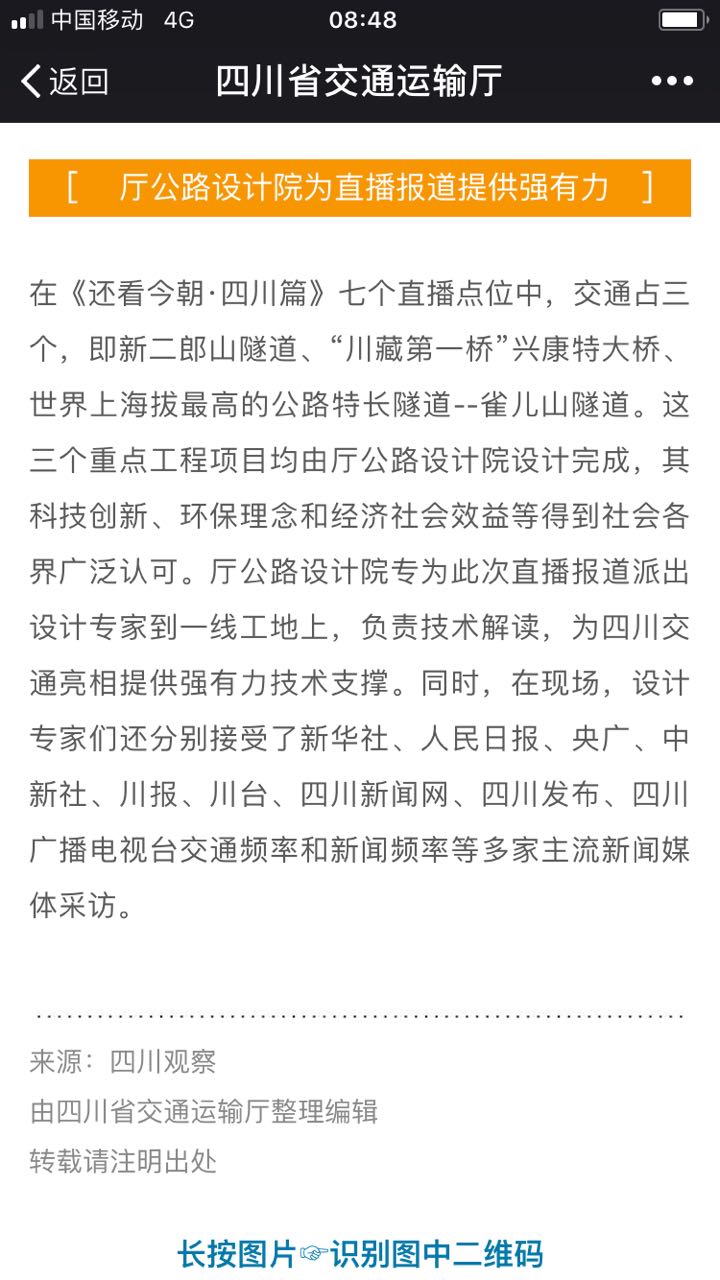 26日上午,四川交通特別是川藏線建設(shè)迎來重大節(jié)點(diǎn),即:新二郎山隧道實(shí)現(xiàn)雙向貫通、“川藏第一橋”興康特大橋首段鋼桁梁主梁吊裝成功、世界上海拔最高的公路特長隧道--雀兒山隧道正式建成通車。央視推出的大型特別節(jié)目《還看今朝.四川篇》用近1小時(shí)直播這三件事。我院設(shè)計(jì)完成了這三個(gè)工程,并專為此次央視直播報(bào)道派出設(shè)計(jì)專家到一線工地上,負(fù)責(zé)技術(shù)解讀,為四川交通亮相提供強(qiáng)有力技術(shù)支撐,充分展現(xiàn)我院綜合實(shí)力。