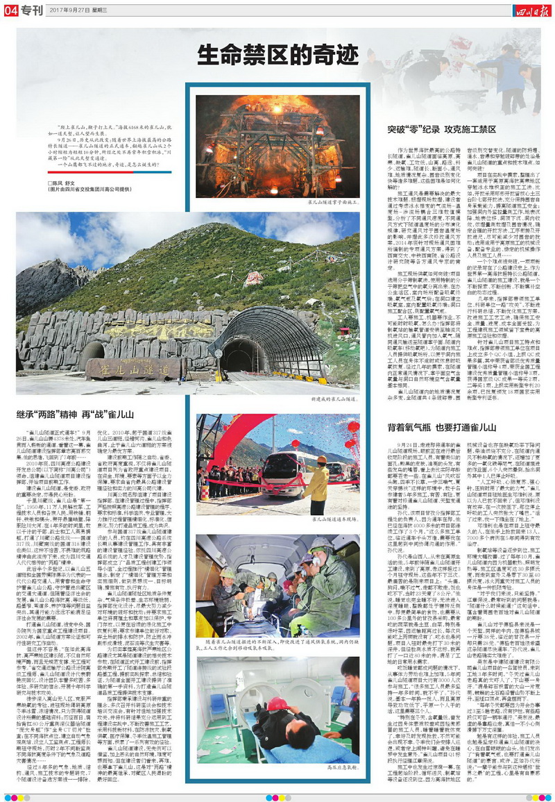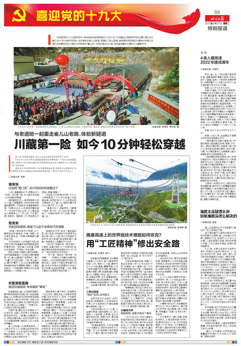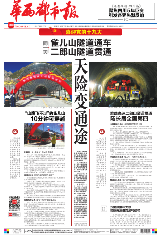 新聞標(biāo)題:同一天 雀兒山隧道通車 二郎山隧道貫通 天險(xiǎn)變通途(9月27日頭版整版)