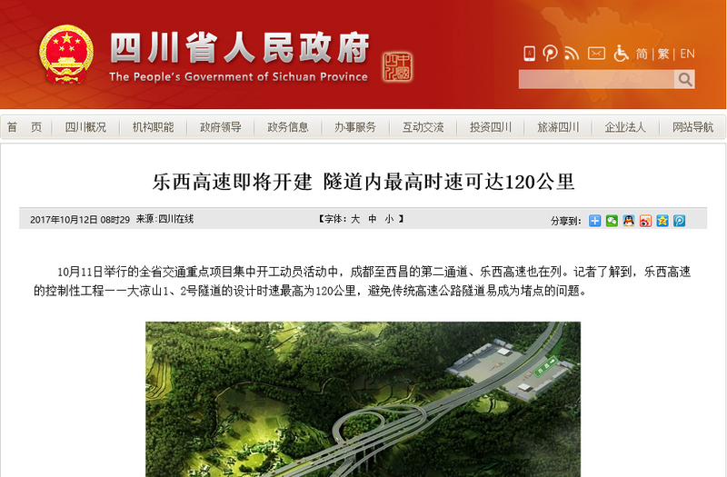 1.樂西高速即將開建 隧道內(nèi)最高時(shí)速可達(dá)120公里(四川省人民政府官方網(wǎng)站10月12日轉(zhuǎn)載報(bào)道)