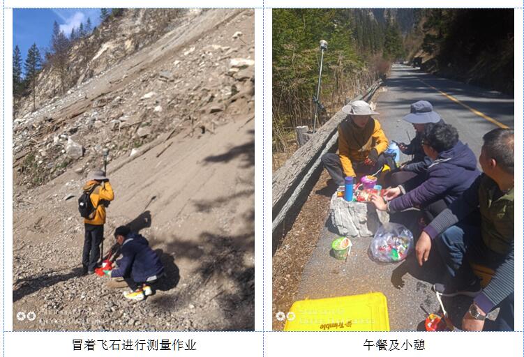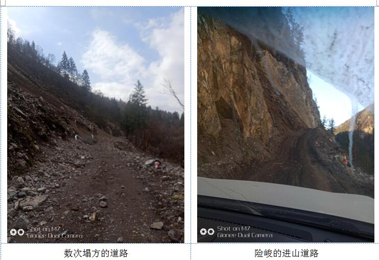 九寨溝災后恢復重建最困難的就是三期工程,尤其是老虎嘴至原始森林路段,在地震中損毀嚴重。本次測量任務艱巨,該段路到處是垮塌嚴重的邊坡,飛石隨時威脅著車輛和人員的安全。