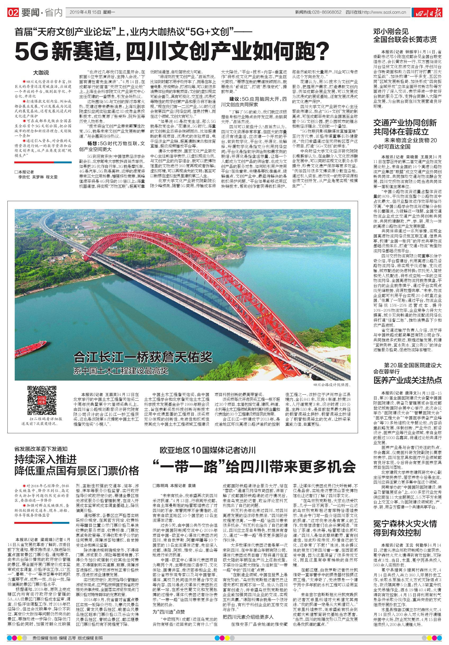 繼人民網(wǎng)、今日頭條、廳微信公眾號(hào)對我公司獲獎(jiǎng)進(jìn)行報(bào)道后,4月12日,四川日報(bào)新媒體川報(bào)觀察、四川電視臺(tái)新媒體四川觀察分別以《今天,合江長江一橋獲詹天佑獎(jiǎng),系中國土木工程建設(shè)最高獎(jiǎng)》和《“四川”設(shè)計(jì)再獲詹天佑獎(jiǎng)》為題,報(bào)道我公司第八次捧起詹天佑獎(jiǎng)杯,4月15日星期一,四川日報(bào)在02版要聞•省內(nèi)以《合江長江一橋獲詹天佑獎(jiǎng)》為題進(jìn)行了專題報(bào)道,充分肯定我公司作為“四川設(shè)計(jì)”的典型代表所取得的輝煌業(yè)績。