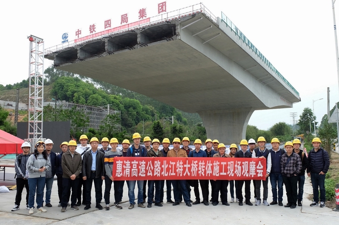 3月31至4月2日,公司派出近30人組成的觀摩團到惠清高速公路北江特大橋(轉體橋)進行現(xiàn)場參觀。北江特大橋是惠清項目建設的控制性工程,該橋為雙幅整體式一次性轉體橋梁,同時跨越京廣鐵路和國道G240,橋梁跨徑為56m+56米,建筑高度20米,橋梁寬度33米,轉體角度87°,轉體重量達14000噸,是廣東省同類型橋梁一次性轉體重量最重、轉角最大的公路橋梁。