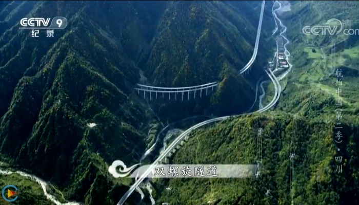 解說提到:“如今,新開通的雅西高速公路徹底改變了橫斷山交通不便的歷史。這是從四川通往云南的汽車主干道,為跨越12條地震斷裂帶和眾多的江河,全長240公里的高速公路上共架設(shè)了270座橋梁。繼續(xù)向南,在干海子,公路需要爬升的坡度終于超過了極限。這一段僅有4公里,爬升的高度卻超過450米,平均每公里爬升150米。為克服這一世界級的工程難題,建設(shè)者在山體上鑿出一上一下兩個螺旋狀的隧道,讓公路通過隧道盤旋上升,用拉長距離的方法,巧妙地減緩了公路的坡度。”