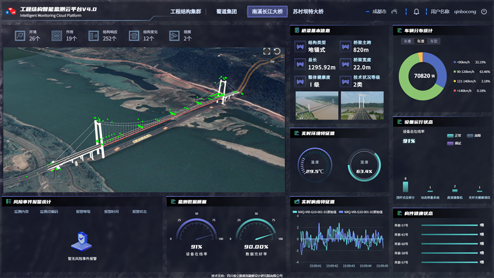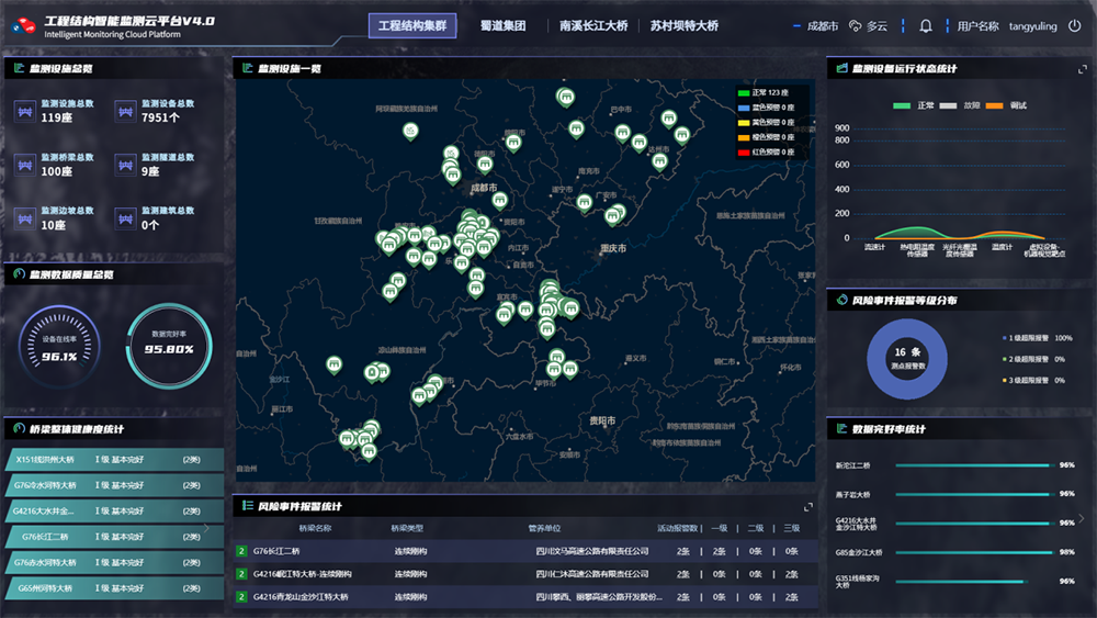 公司順應(yīng)行業(yè)需求,組建了一支集核心技術(shù)和先進裝備于一體的精英團隊,針對山區(qū)公路工程結(jié)構(gòu)隱患與自然災(zāi)害耦合多發(fā)特點,基于GIS+BIM+IoT數(shù)據(jù)底座,疊加物聯(lián)網(wǎng)傳感數(shù)據(jù),融合工程全壽命周期多源異構(gòu)信息,自主創(chuàng)新研發(fā)了“工程結(jié)構(gòu)安全智能監(jiān)測云”平臺,可對橋梁、隧道、邊坡路堤、房屋建筑進行全天候、自動化遠程監(jiān)測?;讵殑?chuàng)的數(shù)據(jù)挖掘和智能算法,提出了面向云計算的結(jié)構(gòu)安全風(fēng)險監(jiān)測、預(yù)警及評估成套技術(shù),形成了貫穿結(jié)構(gòu)全壽命周期的安全風(fēng)險辨識分析、系統(tǒng)部署運維、自動預(yù)警與應(yīng)急響應(yīng)、智能評估與決策支持的服務(wù)新模式。面向云計算的結(jié)構(gòu)安全風(fēng)險監(jiān)測、預(yù)警及評估成套技術(shù)已陸續(xù)應(yīng)用于四川、重慶逾兩千余公里高速公路和近十個市州普通公路的百余座橋、隧和邊坡集群化監(jiān)測項目中。通過工程實踐檢驗,其安全預(yù)警準確率超過80%,多次化解重大安全風(fēng)險事件,減少經(jīng)濟財產(chǎn)損失。探索建立了風(fēng)險預(yù)警、響應(yīng)決策和養(yǎng)護指引等聯(lián)動機制和運管體系,實現(xiàn)了“單橋系統(tǒng)+地市級平臺+省級平臺”三級架構(gòu)的互通互聯(lián),主編橋、隧、邊坡監(jiān)測技術(shù)標準/指南十余部,完善了監(jiān)測預(yù)警技術(shù)標準體系。