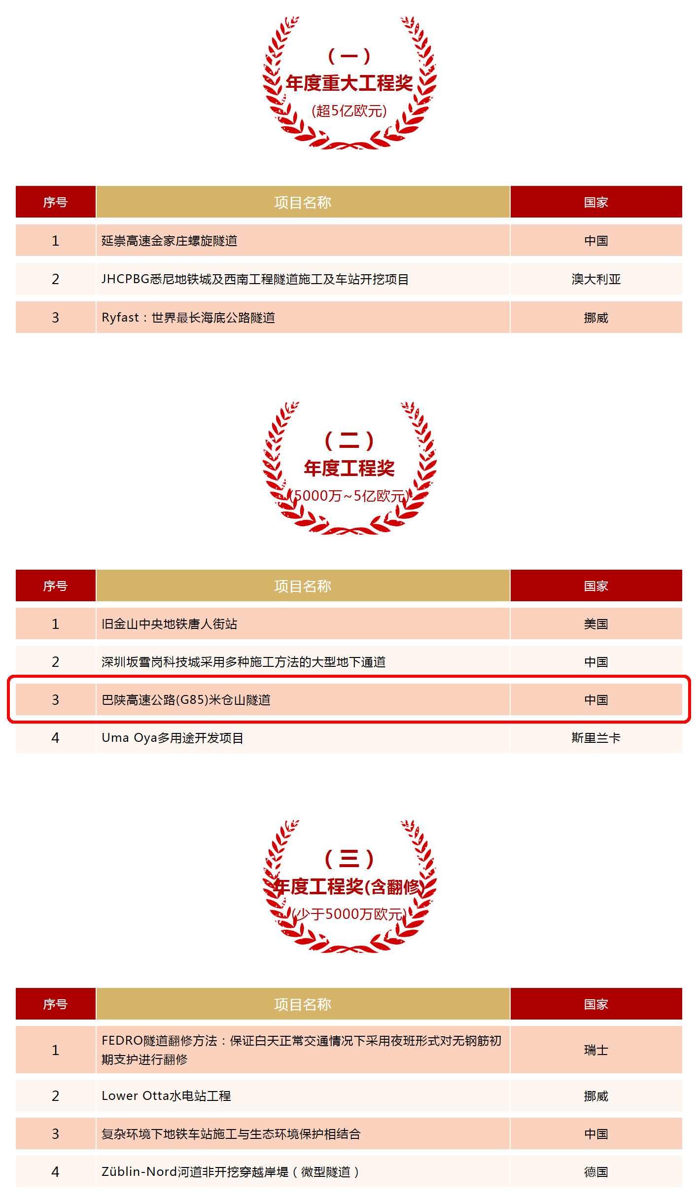 據(jù)國(guó)際隧道與地下空間協(xié)會(huì)(ITA)官網(wǎng)公開信息,2020年10月15日,由我公司設(shè)計(jì)并監(jiān)理的“G85高速公路米倉(cāng)山隧道”項(xiàng)目,已正式入圍2020(第六屆)國(guó)際隧協(xié)(ITA)“隧道年度工程獎(jiǎng)(造價(jià)5000萬~5億歐元)”獎(jiǎng)項(xiàng)提名。這是繼2018年G317雀兒山隧道獲得第四屆國(guó)際隧協(xié)年度工程大獎(jiǎng)提名并最終獲獎(jiǎng)后,我公司承擔(dān)的勘察設(shè)計(jì)項(xiàng)目中,第二個(gè)斬獲ITA“年度工程大獎(jiǎng)”提名的項(xiàng)目,同時(shí)也是繼雀兒山隧道后,我國(guó)大陸地區(qū)第二個(gè)獲得ITA“年度工程大獎(jiǎng)”提名的公路隧道項(xiàng)目。