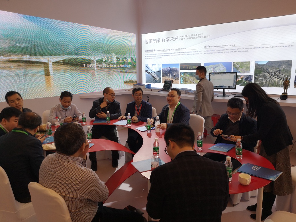 公司副總經理蔣勁松與重慶交通大學土木工程學院朱洪洲副院長(主持工作)一行進行展臺現(xiàn)場交流