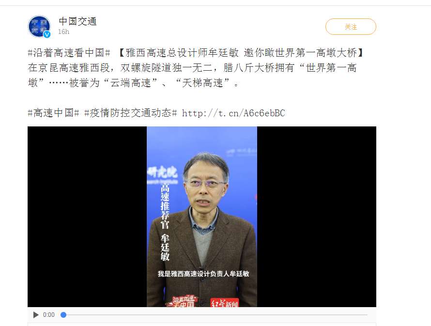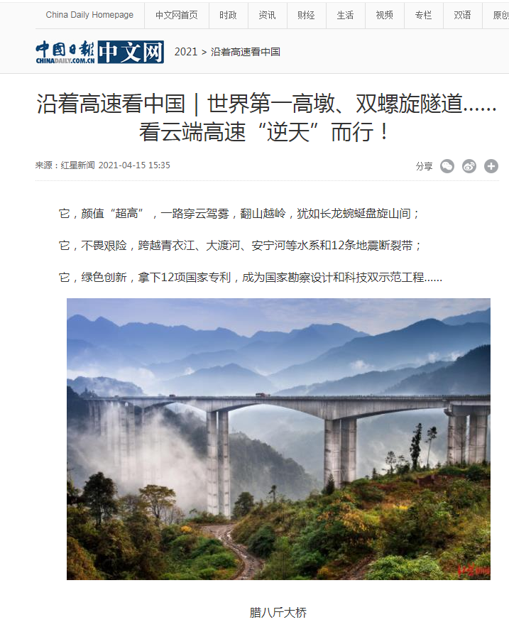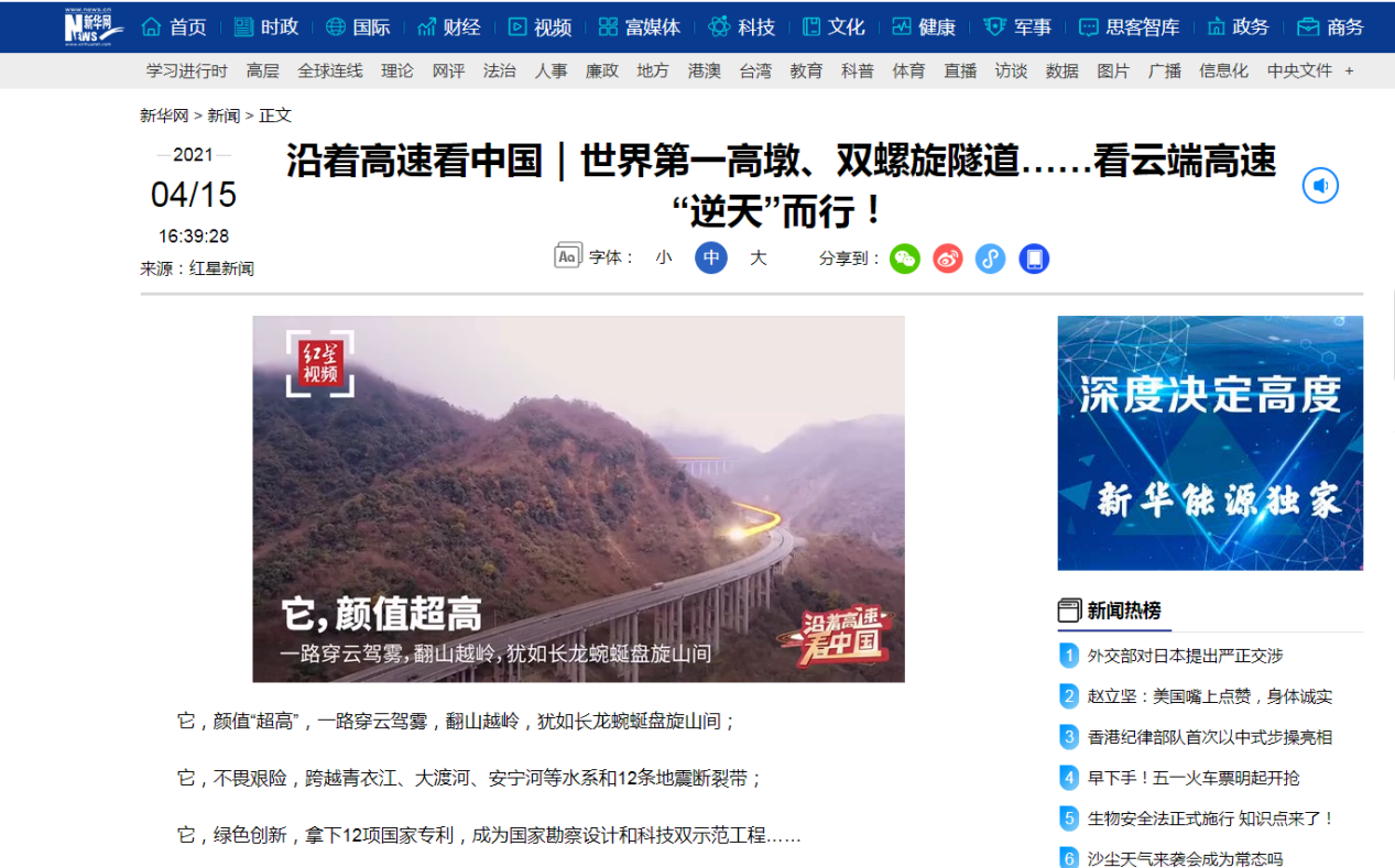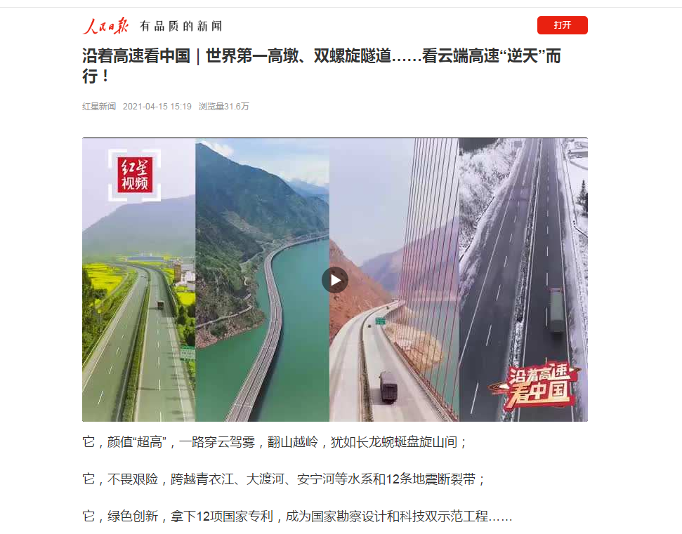 近日,公司依托中宣部會(huì)同交通運(yùn)輸部、文化和旅游部組織的“沿著高速看中國(guó)”全國(guó)性大型主題宣傳活動(dòng),與央廣網(wǎng)、四川電視臺(tái)、成都商報(bào)-紅星新聞等媒體聯(lián)合策劃,以公司總工程師、雅西高速總設(shè)計(jì)師牟廷敏作為“高速推薦官”推介京昆高速的形式,推出《沿著高速看中國(guó)|世界第一高墩、雙螺旋隧道……看云端高速“逆天”而行!》圖文及短視頻報(bào)道。