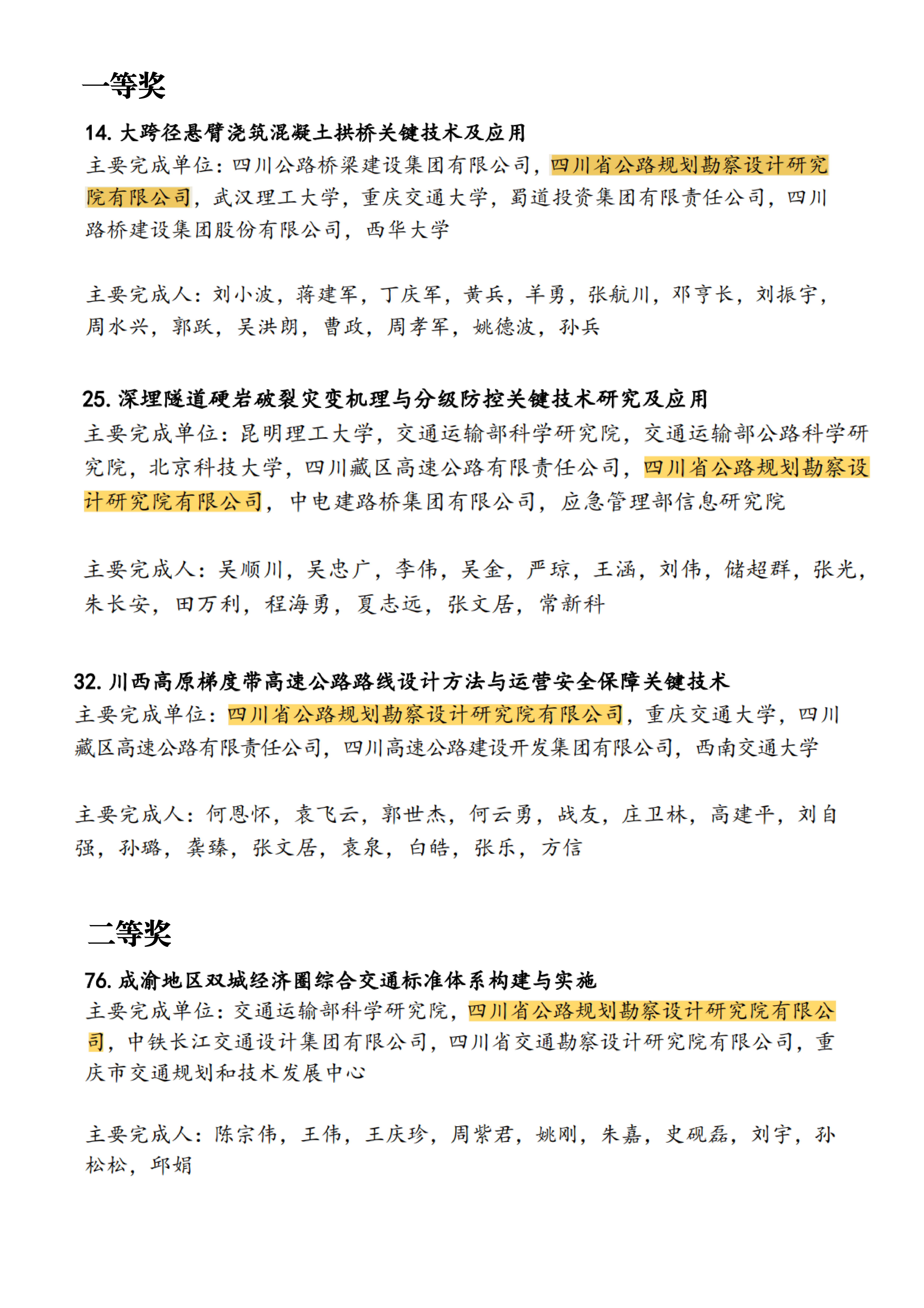 近日,中國公路學(xué)會正式公布2025年度科學(xué)技術(shù)獎獲獎名單,在全國僅評選出37項科技進(jìn)步一等獎中,我司表現(xiàn)亮眼,攻關(guān)研發(fā)的《大跨徑懸臂澆筑混凝土拱橋關(guān)鍵技術(shù)及應(yīng)用》《深埋隧道硬巖破裂災(zāi)變機(jī)理與分級防控關(guān)鍵技術(shù)研究及應(yīng)用》《川西高原梯度帶高速公路路線設(shè)計方法與運營安全保障關(guān)鍵技術(shù)》3項成果斬獲一等獎,同時,《成渝地區(qū)雙城經(jīng)濟(jì)圈綜合交通標(biāo)準(zhǔn)化協(xié)同治理與標(biāo)準(zhǔn)體系構(gòu)建研究及實施應(yīng)用》榮獲二等獎,4項科技成果同時登榜,公司科研能力再獲中國公路學(xué)會重磅認(rèn)可。