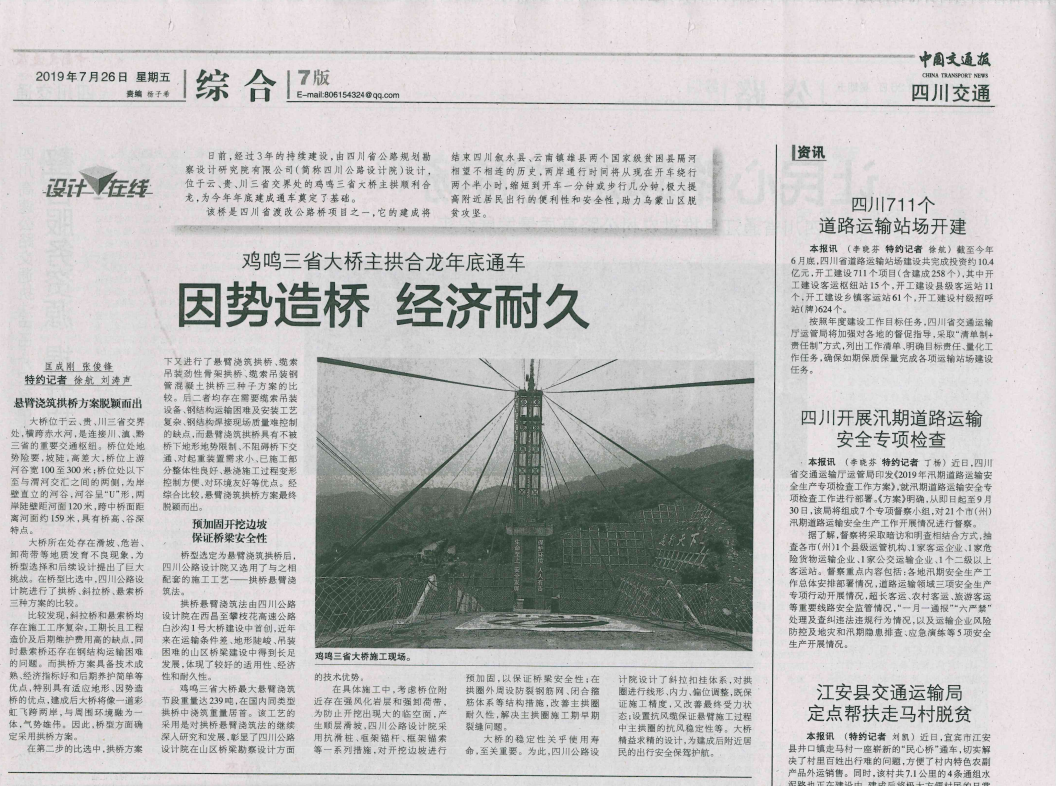 7月26日,《中國交通報》以《因勢造橋 經(jīng)濟耐久 雞鳴三省大橋主拱合龍年底通車》為題深度報道了我公司對剛剛完成主拱合龍的雞鳴三省大橋的設(shè)計細(xì)節(jié),介紹了因地制宜進行多種橋型比選,最終選定拱橋方案,并采用我公司首創(chuàng)的懸臂澆筑施工工藝,設(shè)計中采取預(yù)加固開挖邊坡等系列措施,有效保障了大橋施工及建成通車后附近居民出行安全。