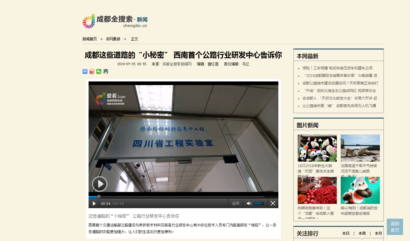 7月25日,成都市新聞門戶網(wǎng)站——成都全搜索網(wǎng)以《成都這些道路的“小秘密” 西南首個公路行業(yè)研發(fā)中心告訴你》為題,采用短視頻與長篇圖文相結(jié)合的形式介紹了我司交通運(yùn)輸部公路建設(shè)與養(yǎng)護(hù)技術(shù)材料及裝備行業(yè)研發(fā)中心在路面再生、排水降噪、綠色環(huán)保、應(yīng)急處置等研發(fā)領(lǐng)域的多項創(chuàng)新及其在成都的應(yīng)用實(shí)例。