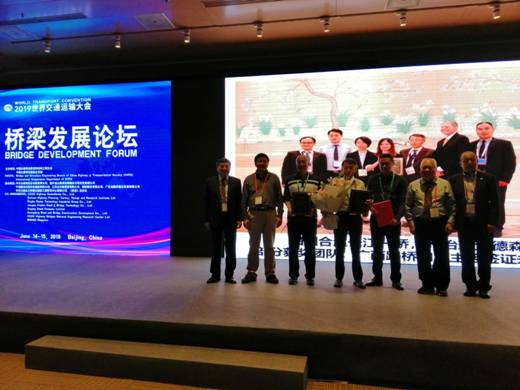 6月14日下午,來(lái)自國(guó)內(nèi)外橋梁界的300多名專家和參會(huì)代表參加橋梁發(fā)展論壇。論壇開(kāi)幕式上,隆重進(jìn)行了第36屆國(guó)際橋梁大會(huì)(IBC)獲獎(jiǎng)橋梁頒獎(jiǎng)儀式,我公司設(shè)計(jì)的合江長(zhǎng)江一橋和瀘定大渡河大橋分別獲得被譽(yù)為橋梁界“諾貝爾獎(jiǎng)”的喬治•理查德森獎(jiǎng)和古斯塔夫•林德撒爾獎(jiǎng),中國(guó)工程院鄭皆連院士、歐進(jìn)萍院士及中國(guó)公路學(xué)會(huì)副理事長(zhǎng)兼秘書長(zhǎng)劉文杰、中國(guó)公路學(xué)會(huì)副理事長(zhǎng)張喜剛分別為公司獲獎(jiǎng)項(xiàng)目頒獎(jiǎng)。牟廷敏總工程師受邀在論壇發(fā)表題為《四川瀘定大渡河興康大橋技術(shù)創(chuàng)新》的主旨演講,全面介紹了公司設(shè)計(jì)的雅康高速瀘定大渡河興康大橋(主橋?yàn)?/span>1100米單跨鋼桁梁懸索橋)的技術(shù)創(chuàng)新情況,公司的技術(shù)創(chuàng)新能力和研發(fā)實(shí)力獲得國(guó)內(nèi)外同行的高度認(rèn)同和廣泛贊譽(yù)。論壇結(jié)束后,牟廷敏總工程師接受了中央電視臺(tái)、人民網(wǎng)等媒體的專訪。