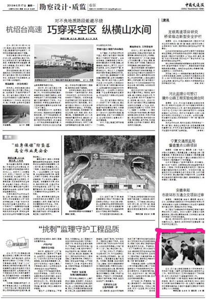 6月17日,《中國交通報》“勘察設計質監(jiān)”版以圖片新聞形式報道了我公司完成昭通(川滇界)至西昌段高速公路物探外業(yè)工作的消息,簡要介紹了該項目基本情況。報道以一張醒目圖片展示了該項目外業(yè)勘測中專家咨詢指導工作情景。