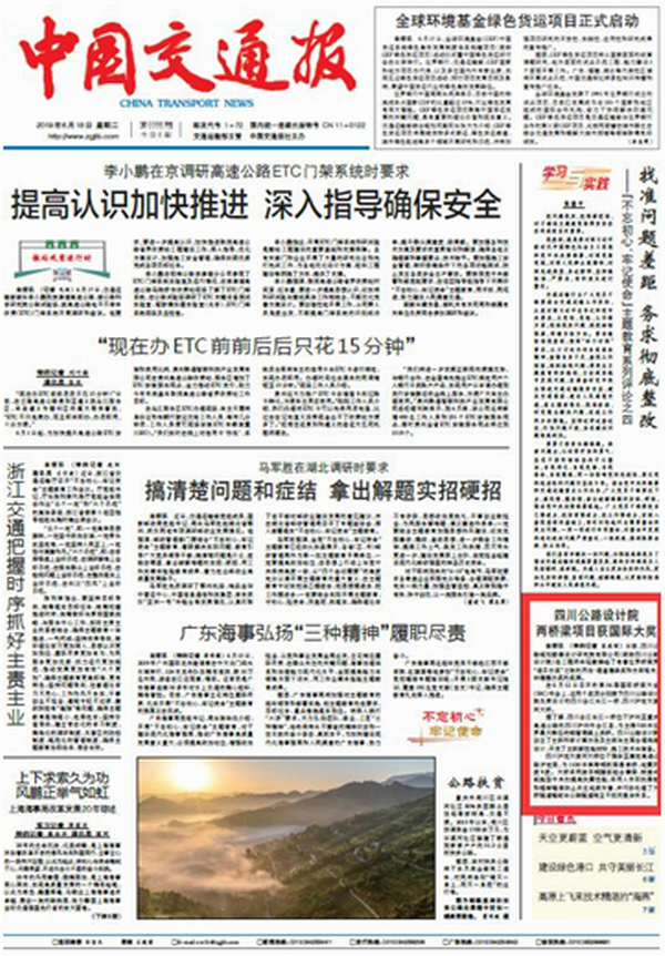 6月18日,《中國交通報(bào)》頭版以“四川公路設(shè)計(jì)院兩橋梁項(xiàng)目獲國際大獎(jiǎng)”為題報(bào)道了合江長江一橋、瀘定大渡河大橋分別獲得國際橋梁大會(huì)喬治•理查德森獎(jiǎng)和古斯塔夫•林德撒爾獎(jiǎng)的消息。報(bào)道了牟廷敏總工領(lǐng)獎(jiǎng),并對(duì)兩個(gè)獲獎(jiǎng)項(xiàng)目設(shè)計(jì)創(chuàng)新作了簡(jiǎn)要介紹?!吨袊煌ㄐ侣劸W(wǎng)》進(jìn)行了同步報(bào)道。網(wǎng)址如下: