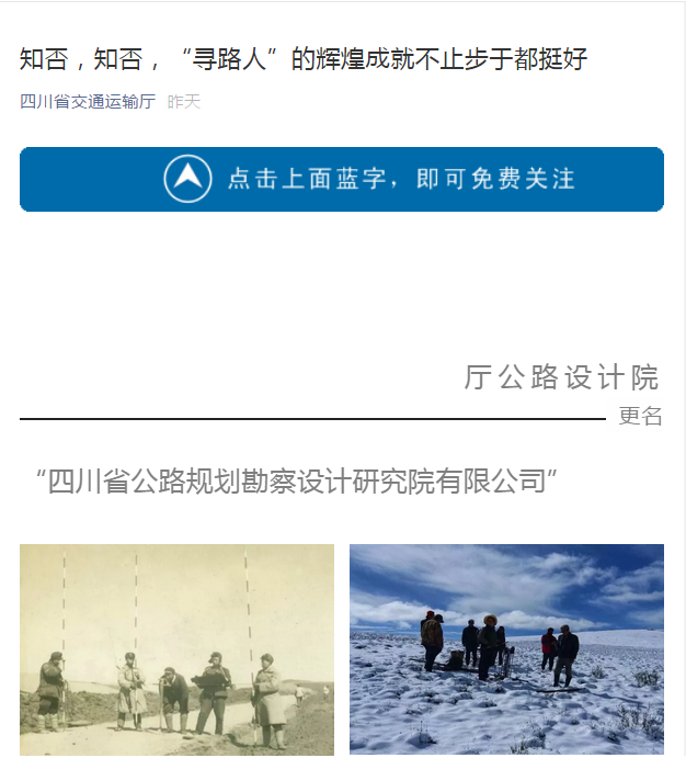 4月2日,公司成功舉行揭牌儀式。省交通運輸廳微信公眾號和《人民網(wǎng)》以此為由頭,分別以《知否,知否,“尋路人”的輝煌成就不止步于都挺好》和《蜀道難”變“蜀道暢”的背后 66年來“尋路人”們做了些啥?》為題,圖文并茂深度報道了公司66年發(fā)展歷程和輝煌成就,充分展示了我公司作為“四川公路建設(shè)前期工作的主體力量”、“山區(qū)公路勘察設(shè)計技術(shù)創(chuàng)新的行業(yè)典范”、“不畏艱險服務(wù)社會的技術(shù)先鋒”、“溝通世界的對外交流合作伙伴”等方面突出業(yè)績。廳微信公眾號還用了院歌《尋路人》MTV視頻。