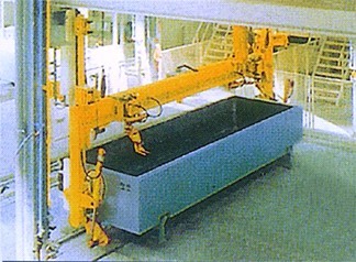 空中翻轉(zhuǎn)工藝屬于加氣磚生產(chǎn)線、加氣磚生產(chǎn)線中較重要的工序,空中翻轉(zhuǎn)工藝設(shè)備將坯體(帶模具、側(cè)板)在空中翻轉(zhuǎn)90度,吊具放在切割臺(tái)或切割小車上,脫去�?颍黧w即能切割。